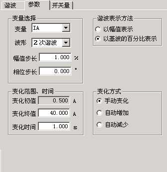 幅值步長:這里的步長也與“諧波表示方法”相對應。當選擇“以幅值表示”時,步長也以幅值表示,單位是A或V;而選擇“以基波的百分比表示”時,則步長也是百分比。