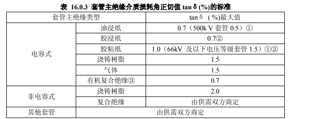 2.應(yīng)在分閘狀態(tài)下測(cè)量每只套管的 tanδ 。當(dāng)測(cè)得值超過標(biāo)準(zhǔn)時(shí),應(yīng)卸下油箱后進(jìn)行分解試驗(yàn),此時(shí)測(cè)得的套管的 tanδ (%)值,應(yīng)符合本標(biāo)準(zhǔn)表 16.0.3 的規(guī)定。