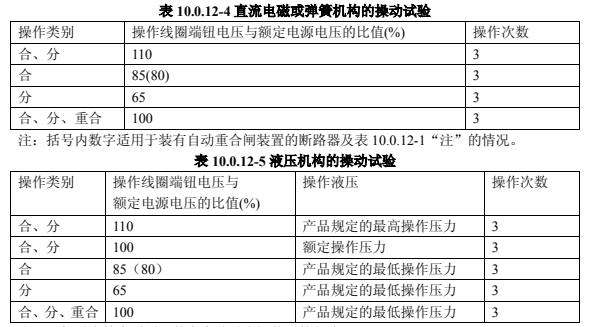 直流電磁或彈簧機構(gòu)的操動試驗,應(yīng)按表 10.0.12-4 的規(guī)定進行;液壓機構(gòu)的操動試驗,應(yīng)按表 10.0.12-5 的規(guī)定進行。