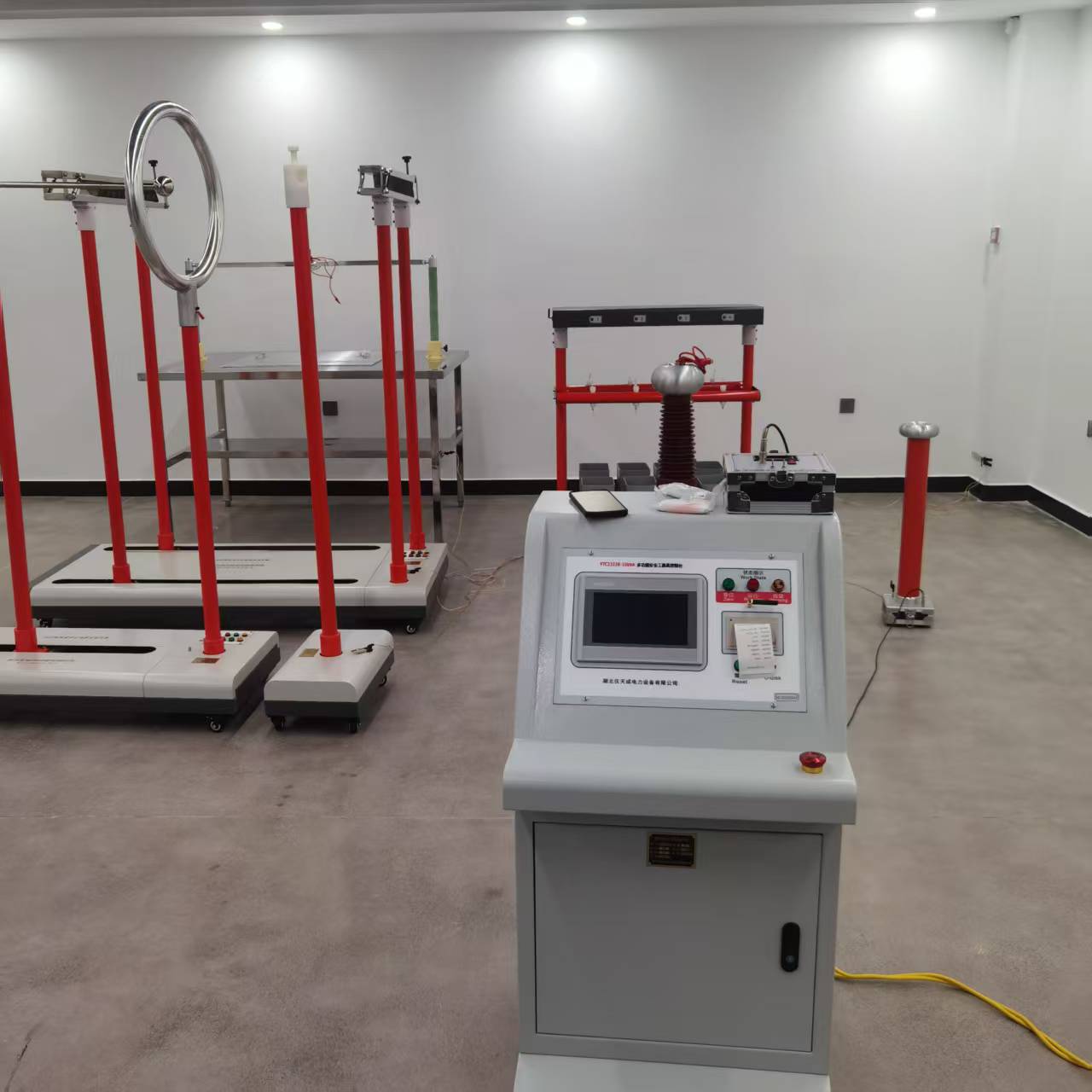 本次客戶那邊采購的我司一套絕緣安全工器具檢測裝置其主要包括:無線脫扣絕緣靴(手套)測試裝置、電動絕緣桿測試支架、電動驗電器、絕緣墊試驗電極。無線脫扣絕緣靴(手套)測試裝置主要是針對于絕緣靴、絕緣手套安全工器具進(jìn)行智能化絕緣耐壓試驗,其可以支持多雙絕緣靴或絕緣手套的試驗,并測量每只試品的泄漏電流,采用里面放置小鋼珠的干式試驗方法,擺脫了傳統(tǒng)的往鞋子里灌水做試驗,試驗完畢后不易曬干的做法。電動絕緣桿測試支架,該測試裝置采用了電動自動移動形式,可以更加方便準(zhǔn)確地對絕緣桿進(jìn)行絕緣性能檢測,電動驗電器也是采用電動自動移動驗電棒,免去人為調(diào)整的麻煩度,且更安全。絕緣墊試驗電極是針對于絕緣墊進(jìn)行絕緣檢測的,其采用鋁合金材料制作,絕緣墊可以放置在桌面上,通過電極施加電流來進(jìn)行絕緣性檢測。