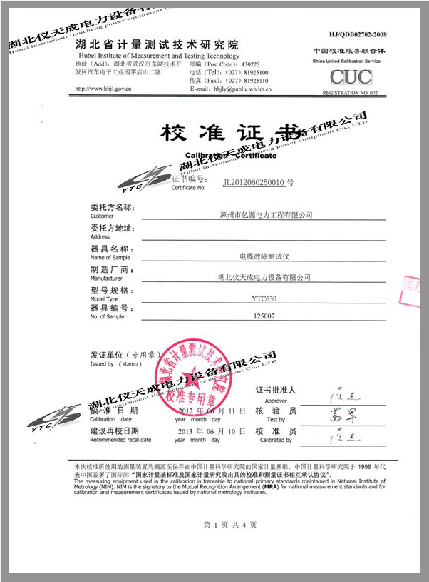 YTC630電纜故障測試儀鑒定證書